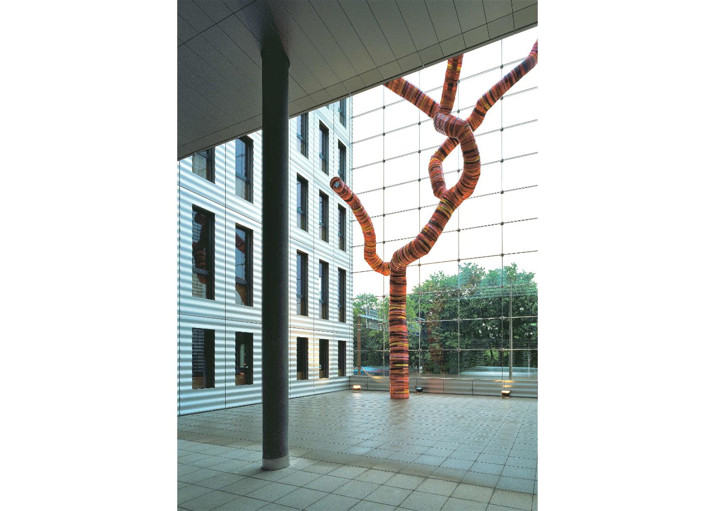 Frau Amadio, die bei der Gestaltung völlig frei Hand hatte, hat das imposante Kunstwerk im Auftrag des Architekturbüros Zwimpfer und Partner entworfen, welches auch für den Bau des gesamten Gebäudekomplexes verantwortlich war. Sie hat dem Büro zu Beginn drei Entwürfe mit unterschiedlicher Farbgebung vorgeschlagen. Herr Zwimpfer hat schliesslich jenes mit den überwiegenden Rottönen ausgewählt.