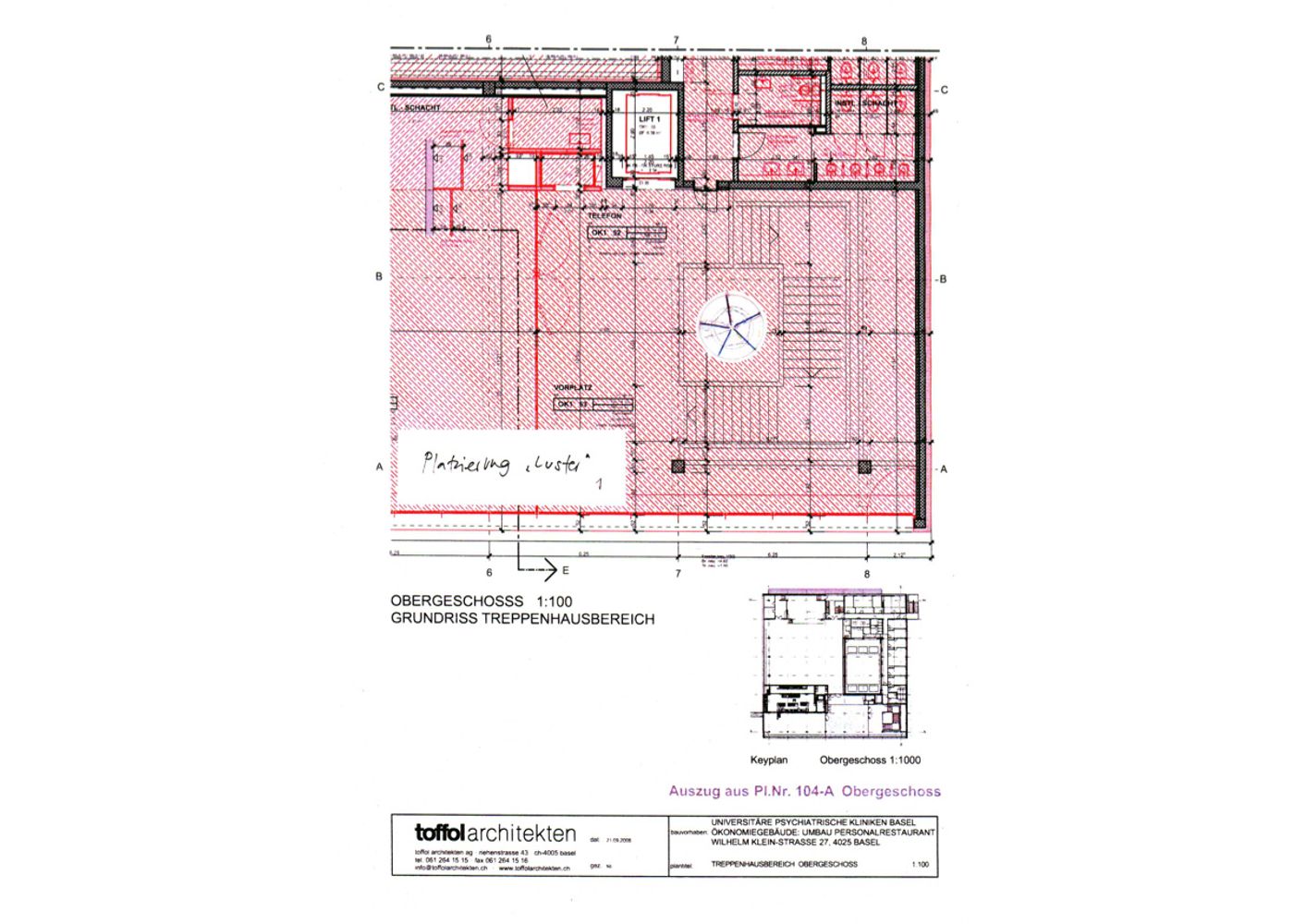 ..Das aus den 60er Jahren stammende Oekonomiegebäude der Universitären Psychiatrischen Kliniken Basel wird einer Gesamtsanierung unterworfen. Dabei werden die gastronomischen Betriebsabläufe modernisiert. Das Personalrestaurant soll räumlich erweitert und die Verpflegungskapazität im Hinblick auf die Durchführung von Kongressen und Symposien erhöht werden. Nicht nur die Infrastruktur wird modernisiert, auch die gesamte Innenausstattung wird neu gestaltet. In diesem Zusammenhang werden Mittel für eine künstlerische Intervention bereitgestellt. Der dafür bestimmte Perimeter umfasst den gesamten Zugangsbereich zum Personalrestaurant.