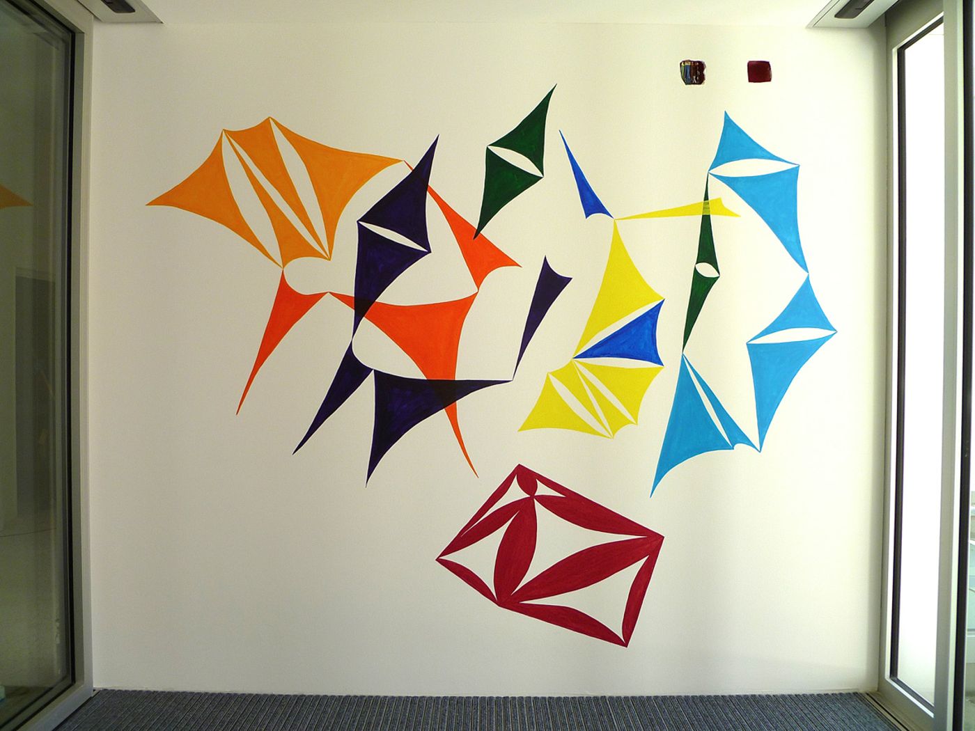Das vorgeschlagene Projekt „Bukes“ entstand durch die beiden letzten hier aufgeführten Textabschnitte welche die Aussenfassade und die Gartenwege beschreiben. Die Licht und Umgebung reflektierenden, sich fast spiegelähnlich verhaltenden Bänder aus keramischen Elementen fungierten mit ihren einzelnen Formen als ornamentale Grundmusterung. Diese sich in verschiedenen Grössen zeigenden Dreiecke dienten als Vorlage für die darin neu zu erfindenden und entwerfenden Formen. Es entstanden pflanzenartige, blumenähnliche bis ganz abstrakte, gar geometrische Malereien mit unterschiedlichen Farbkompositionen und Form Rhythmen. Entstanden ist diese Arbeit durch ein prozesshaftes und konzeptuelles Denken mit Berücksichtigung auf den Ort, das Seniorenzentrum, den architektonischen Überlegungen an der Aussenfassade und den Innenbereichen mit ihren Aufgaben und Funktionen.